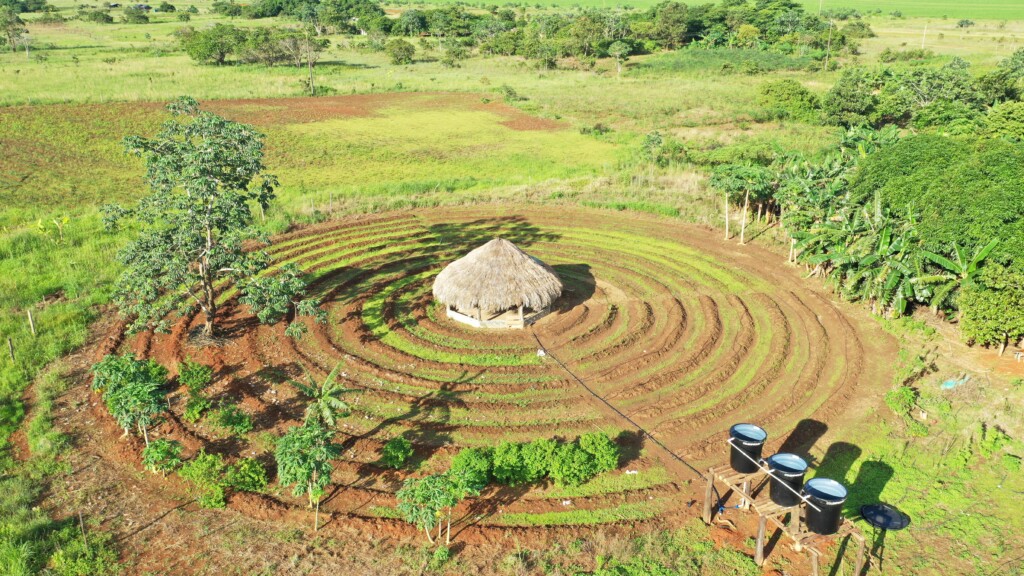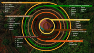- Diseño circular tipo mandala, que optimiza el uso del espacio, facilita el manejo del agua y promueve la biodiversidad mediante cultivos sucesionales y complementarios.